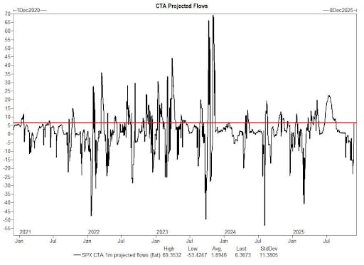 CTA 賣壓竭盡轉買,關注關鍵反轉點位:CTA(動能交易策略)在 11 月大幅拋售了 230 億美元的美股後,這波單邊賣壓似乎已畫下句點。圖表顯示資金流向出現轉折,目前模型在多數市場情境下已轉為有利於買進(Better to Buy)。交易員正緊盯短線關鍵點位 6716,若能成功站上此關卡,將確認趨勢反轉,有望迎來新一波程式化買盤進場。