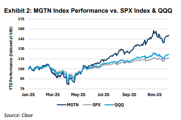 MGTN 指數反攻:追蹤十大科技/AI 公司的 MGTN 指數 擺脫了 11 月的頹勢,目前距離歷史高點僅差 3% 。今年以來 (YTD) 該指數上漲超過 50%,遠超標普 500 (SPX) 的 16% 和那斯達克 100 (QQQ) 的 22% 。