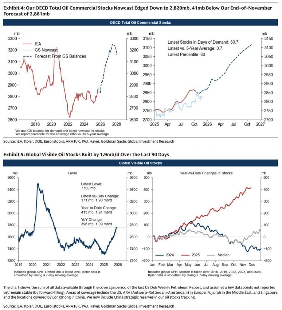全球石油庫存激增:市場供過於求的警訊:這張圖表揭示了全球石油市場正在快速累積庫存。雖然 OECD 國家的庫存(上圖)略低於預期,但更廣泛的「全球可見庫存」(下圖)在過去 90 天內以每日 190 萬桶的速度急劇攀升。右下角的走勢圖清楚顯示,2025 年的累積速度(紅線)遠高於 2024 年(藍線)與歷史平均(灰線),這強烈暗示供應端過剩,庫存壓力正在加大。