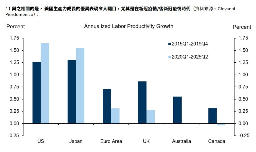 美國硬體投資狂潮:電腦設備的垂直爆發:這張圖表展示了美國設備投資金額的驚人分化。最震撼的是「電腦與周邊設備」(Computers & Peripheral, 紅線) 的支出呈現完全違反地心引力的垂直式飆升,遠遠甩開了電力傳輸 (藍線) 與一般辦公設備 (灰線)。這直接反映了在 AI 浪潮驅動下,全美企業正不惜代價瘋狂採購高階運算硬體,這種指數級的增長速度是過去 20 年前所未見的。