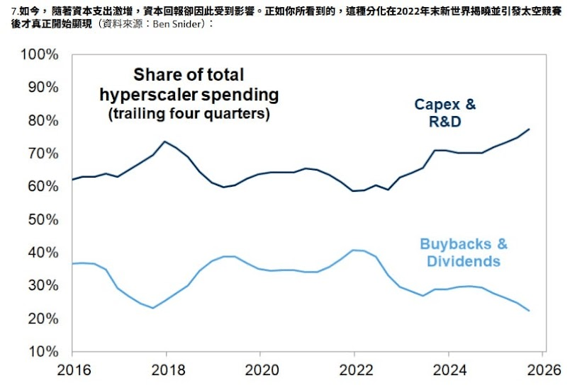 科技巨頭資金大轉向:棄回購、拚研發:這張圖表揭示了科技巨頭(Hyperscalers)資本配置的歷史性轉折。過去,這些公司傾向將現金用於股票回購與股利發放(淺藍線)以回饋股東;但自 2022 年底起,為了應對 AI 浪潮,資金大規模轉向資本支出與研發(深藍線)。兩條線的「黃金交叉」標誌著矽谷正式進入軍備競賽模式,巨頭們寧願犧牲短期股東回報,也要將每一分錢投入未來的 AI 基礎建設。