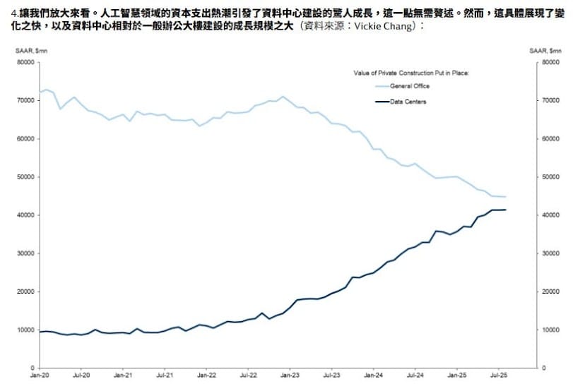 建設資金大挪移:資料中心狂飆 vs. 辦公樓冷卻:這張圖表展示了美國私人營建支出的結構性轉變。隨著 AI 浪潮推動算力需求,資料中心 (Data Centers, 深藍線) 的建設支出自 2023 年起呈現爆發式增長,直線向上攀升;與此形成強烈對比的是,受遠距工作與商用不動產疲軟影響,一般辦公室 (General Office, 淺藍線) 的建設支出則持續萎縮。兩者走勢形成的「黃金交叉」清楚揭示了實體建設資金正從傳統辦公空間,大規模轉向支撐 AI 發展的基礎設施。