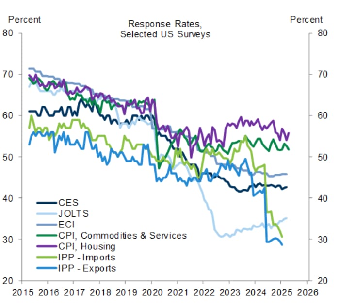 總經數據可靠性降低:上週CPI引發許多爭議,尤其是聯準會最愛的記者Nick Timiraos的發文尤為受到關注。實際上由於問券回覆率下降以及資料收集難度變高,使得許多資料點是用推算而得的,進而引發投資人對數據可靠性的質疑。