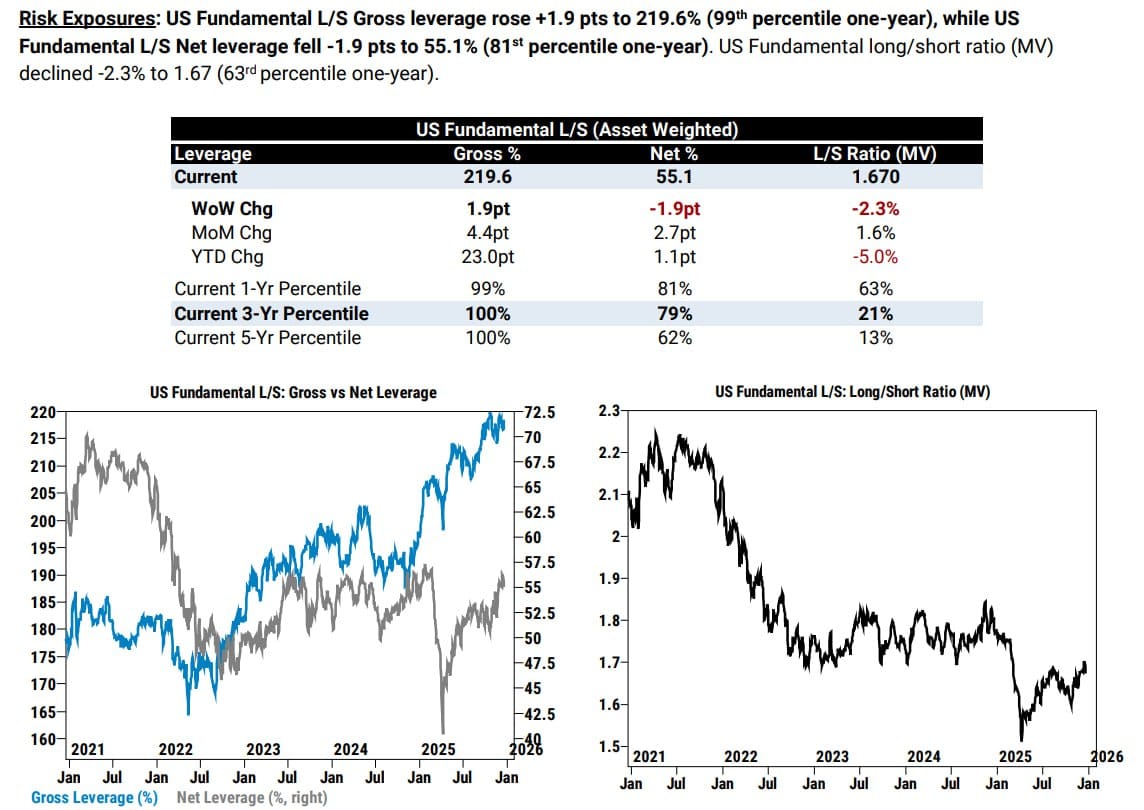 對沖基金總槓桿逼近歷史新高:高盛統計其對沖基金客戶總槓桿又逼近歷史新高,淨槓桿也處於偏高的水位,顯示其並沒有太多bias,仍舊關注下檔風險。衡量其半導體部位的指標也處在五年以來高位。