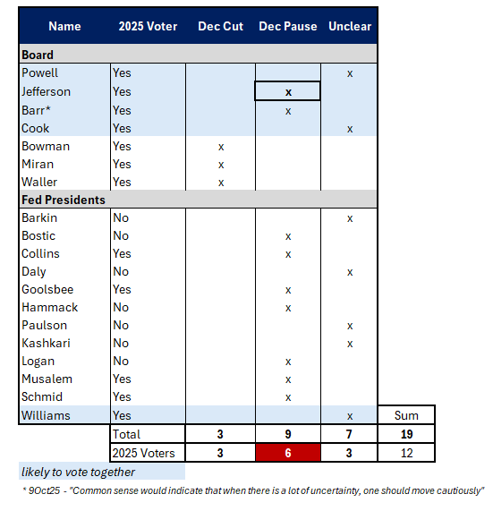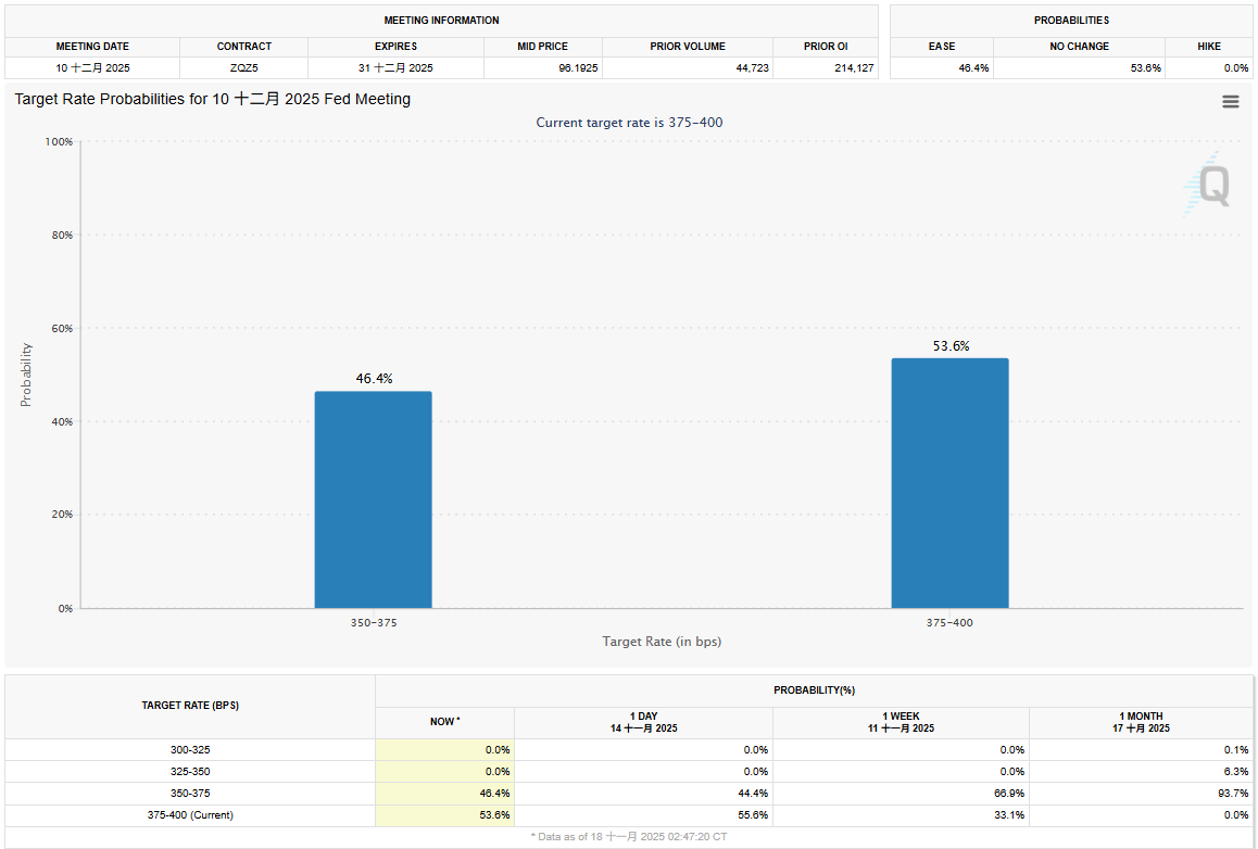12月是否降息仍不明朗:受政府關門影響,10月CPI數據缺失、也可能缺少一份非農就業報告,Fed能參考的資料變少;根據公開評論,估計在 12 位投票委員中,傾向維持利率不變的委員佔多數(估計有 8 位);政府開門後,金融條件相較前陣子寬鬆不少;通膨雖往上但相當穩定。 12月維持利率不變的預期持續提升。