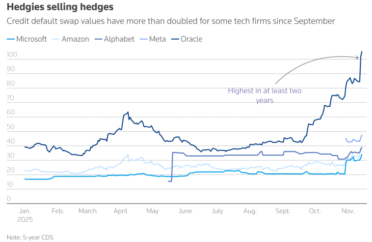 債務預警:雖然目前大家都認定AI是未來趨勢,但其早期投資數額之大使一些投資者產生疑慮,市場開始認為現金流相對不強勁的公司債務違約風險浮現。