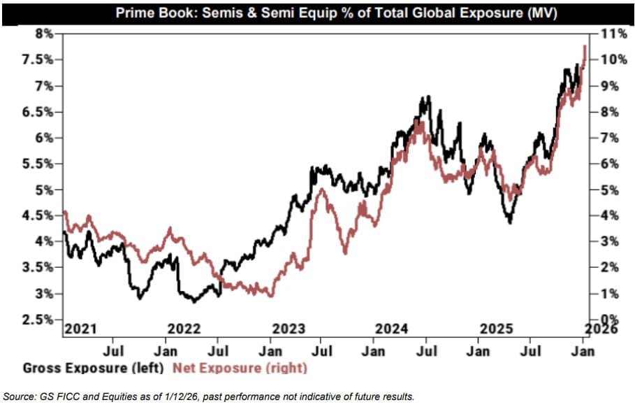 上週資金流向:高盛股票經紀商數據顯示對沖基金持續撤出軟體部位,買進電力基礎設施、半導體硬體和記憶體,尤其記憶體受到廣泛的追價。