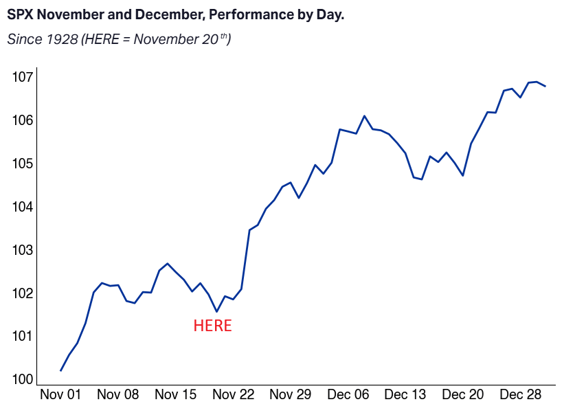 為年底反彈做準備:根據高盛交易室的預估,其客戶並沒有恐慌賣出,這波下跌完全可能是量化基金造成,這對年底反彈非常有利。 根據標普過去95年的歷史平均報酬,從這裡開始就要一路走高到年底。